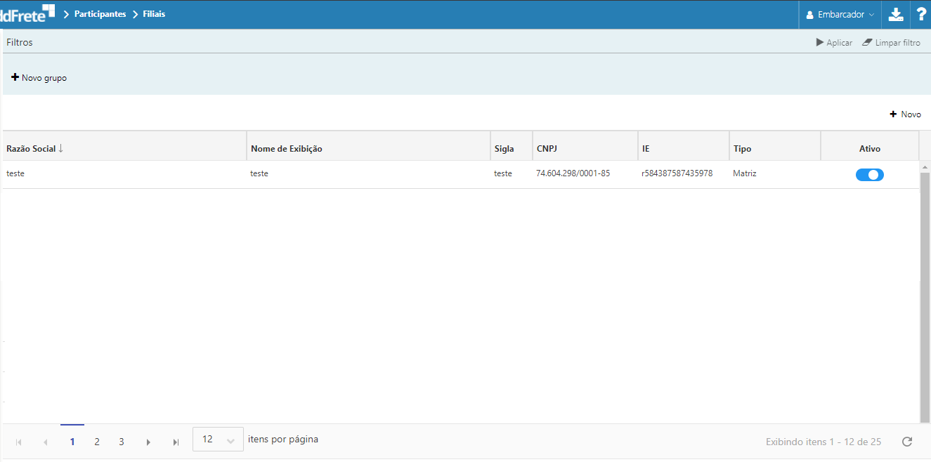Para cadastrar uma nova filial, clique no botão Novo, o qual fica à direita, acima dos registros já cadastrados.
