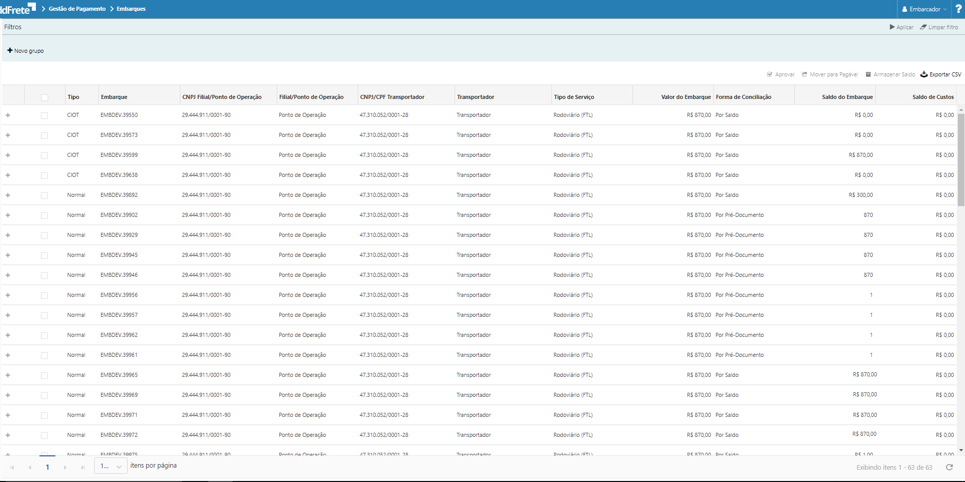 Aprovar: Permite aprovar embarques para que possa seguir o fluxo do pagamento automático ou semi-automático;