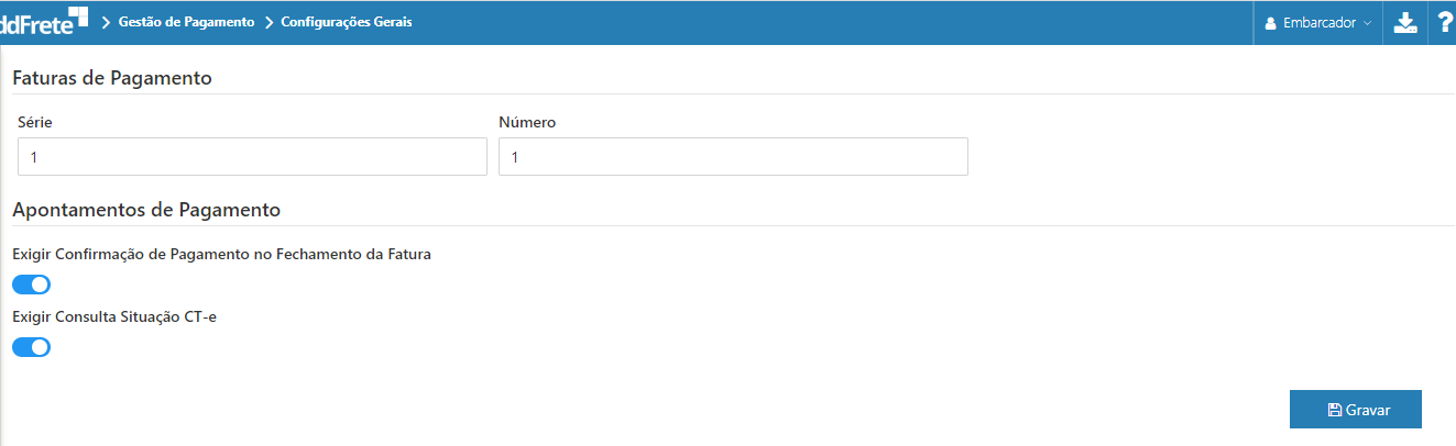 •Exigir Consulta Situação CT-e - Configuração que será ou não uma condição para Validar a Fatura, possibilitando que um Documento que não seja localizado na SEFAZ, ou mesmo por indisponibilidade do serviço da mesma, possua fatura fechada ou não.