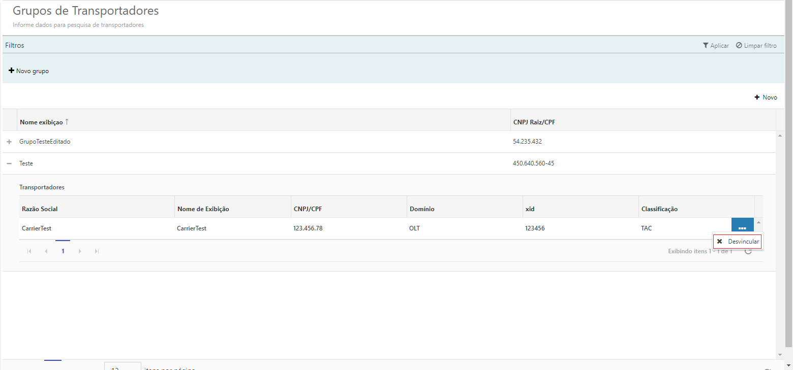 Na tela principal estão disponíveis os grupos já existentes e os transportadores vinculados aos mesmos.