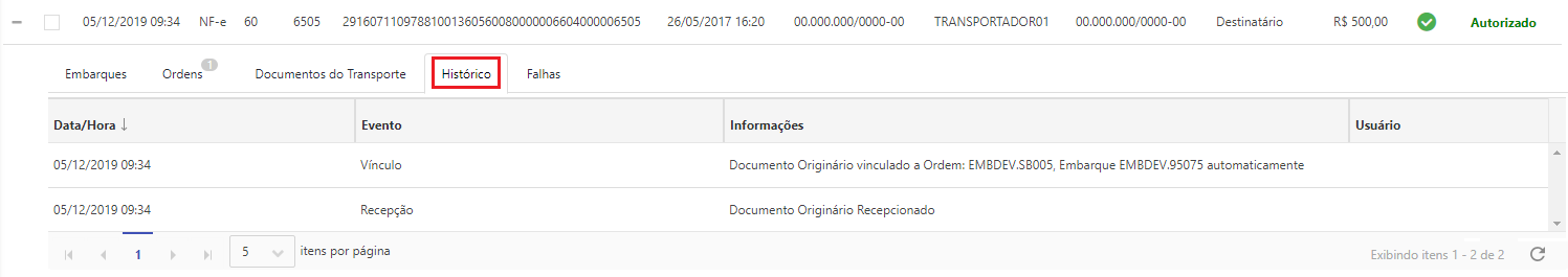 •Documentos do Transporte: Esta aba apresentará os documentos do Transporte vinculados ao documento originário.