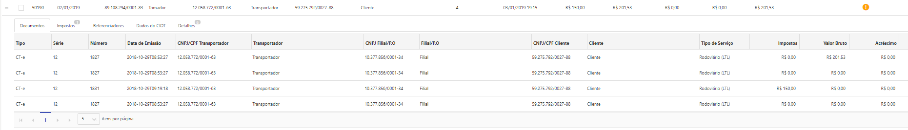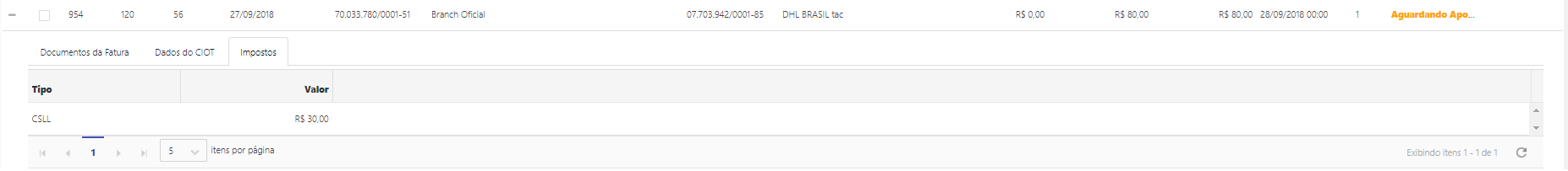 *Para que a Fatura apresente impostos do tipo CT-e é necessário que a Gestão Financeira receba e apresente estes valores na visão de Documentos.