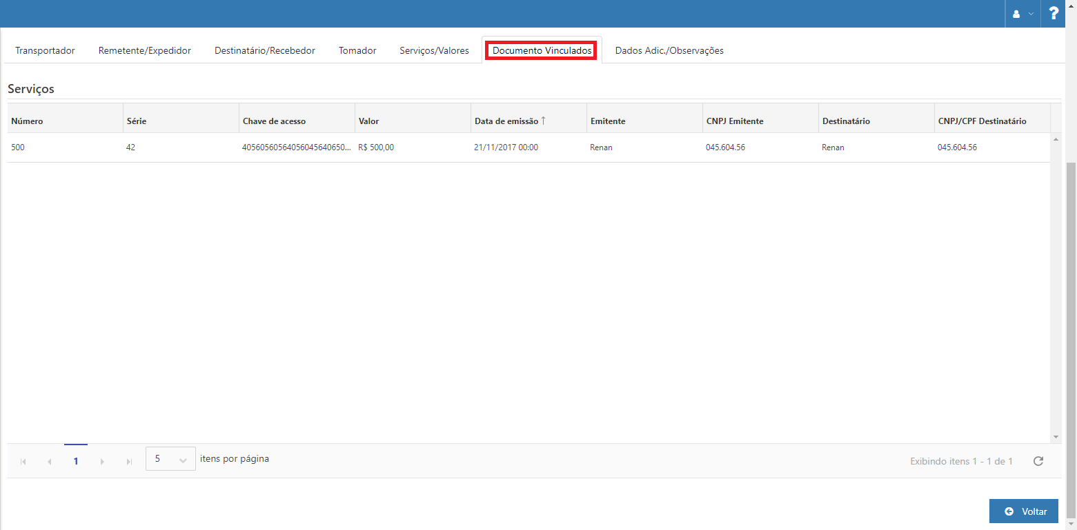 A aba Documentos Vinculados exibe as NF-es ou ordens de carregamento vinculados ao documento.