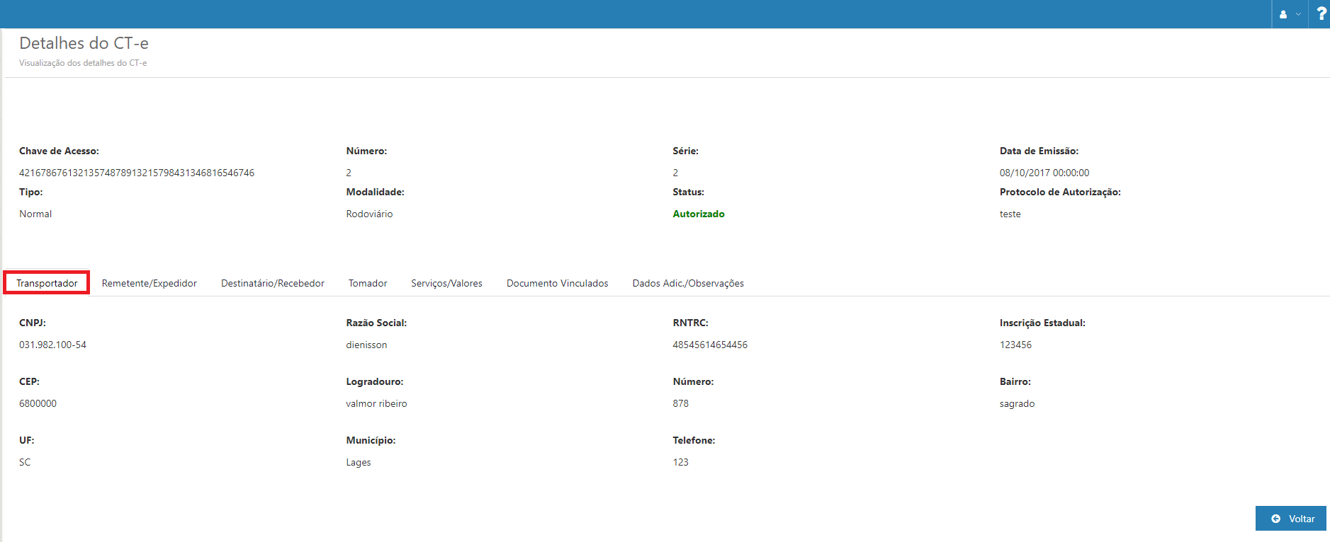 A aba transportador exibe os dados do transportador, capturados ao recepcionar o documento.
