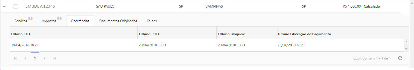 •Ocorrências: Nessa aba é possível visualizar todas as ocorrências geradas para Ordem vinculada ao Embarque selecionado.