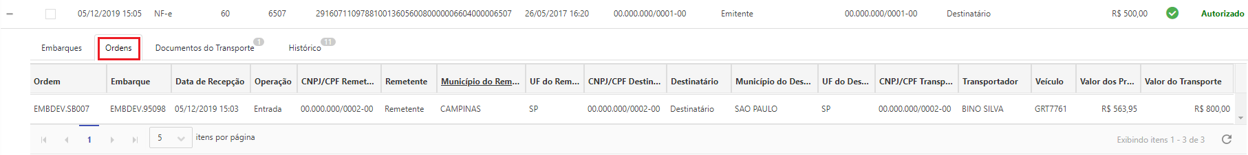 •Documentos do Transporte: Esta aba apresentará os documentos do Transporte vinculados ao documento originário.