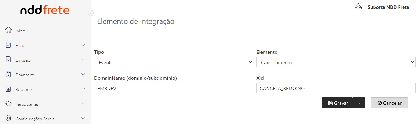Para que o retorno do cancelamento seja enviado para o TMS, é necessário que esta integração esteja devidamente configurada nas Configurações Gerais \ Gerais \ Integração TMS, com o Tipo: Evento e Evento: Cancelamento. Conforme o exemplo: