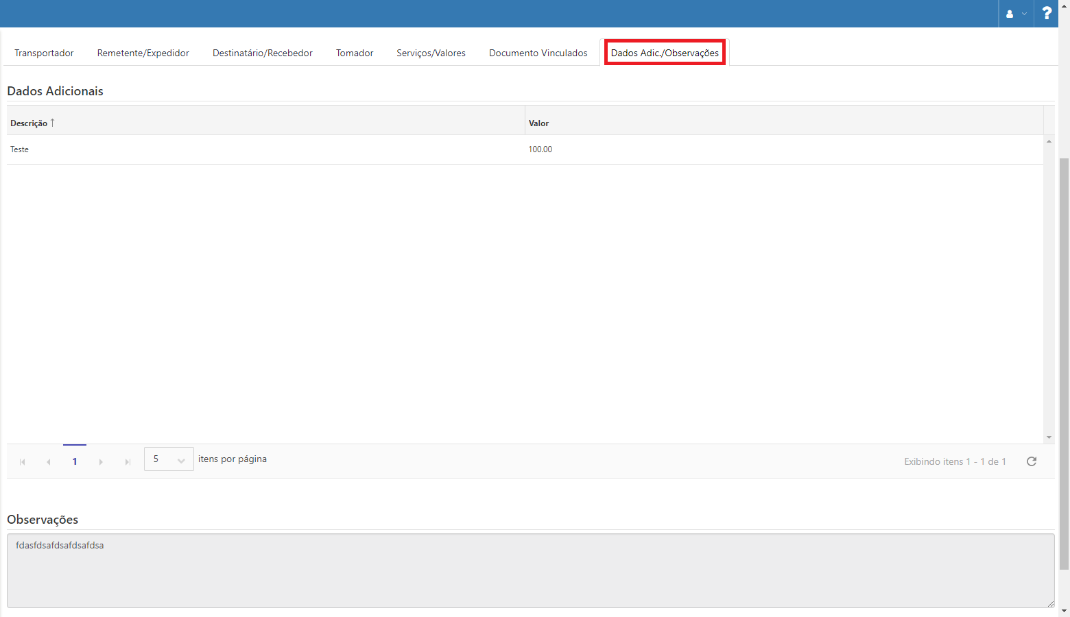 A aba Dados Adic./Observações exibe dados adicionais e observações referente ao documento.
