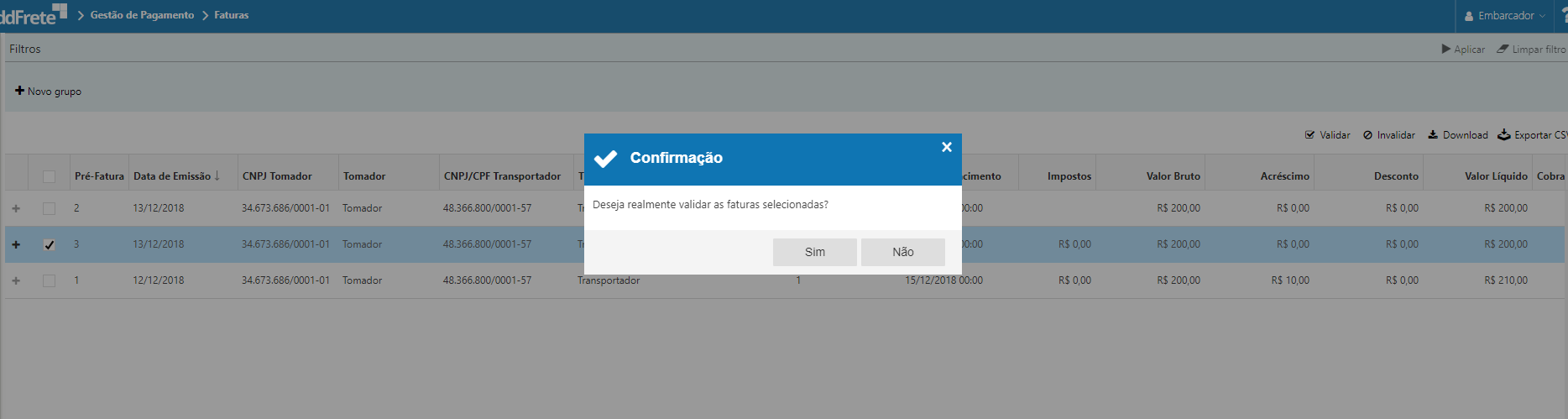 Ao clicar na ação "Validar" é exibido um pop-up de confirmação se deseja realmente fechar a fatura selecionada: