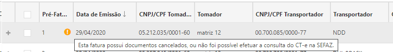 Caso a opção Exigir Consulta Situação CT-e esteja confirmada nas configurações gerais. Ao validar a fatura é feita uma consulta na situação do documento, caso ocorra algum pendência nessa consulta a fatura vai exibir um ícone de exclamação contendo a mensagem da pendência. |