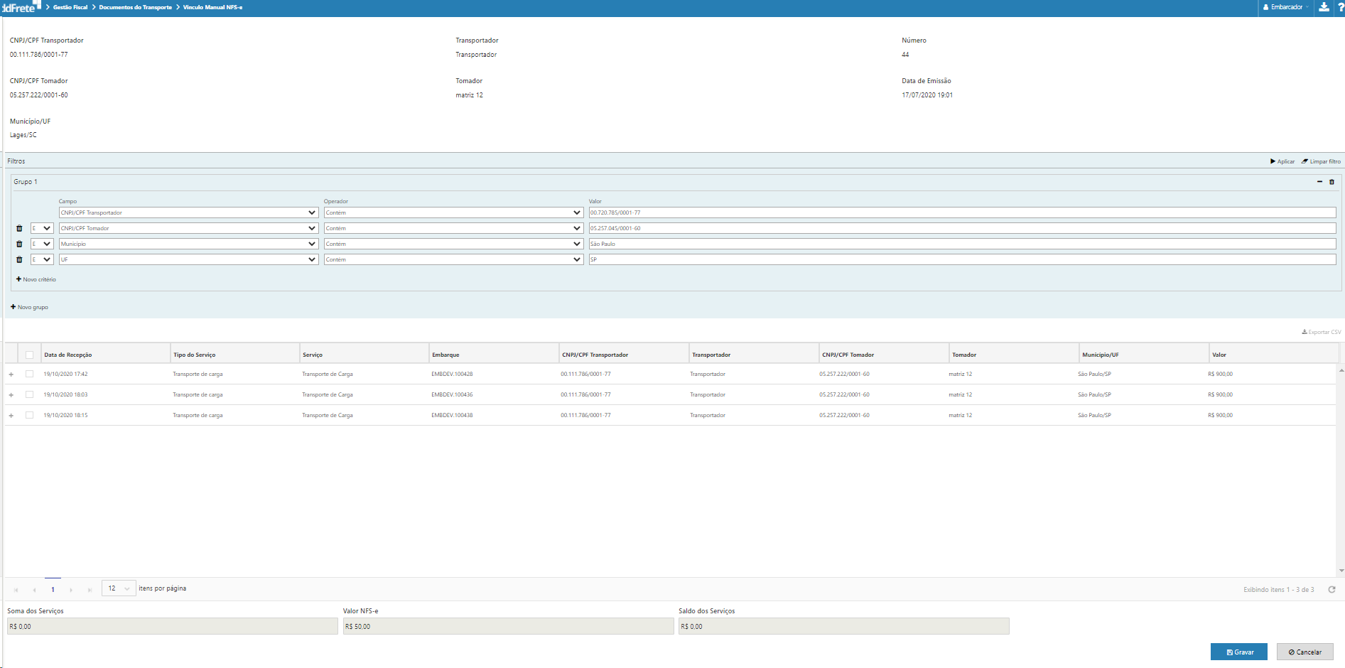A visão de vínculo manual de NFS-e apresenta serviços que possuam transportador no mesmo grupo do transportador da NFS-e.