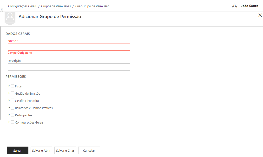 •Novo: Através deste botão é possível criar um novo Grupo de Permissão. Informando seu Nome, Descrição e também as funcionalidades que o o Grupo vai ter acesso.