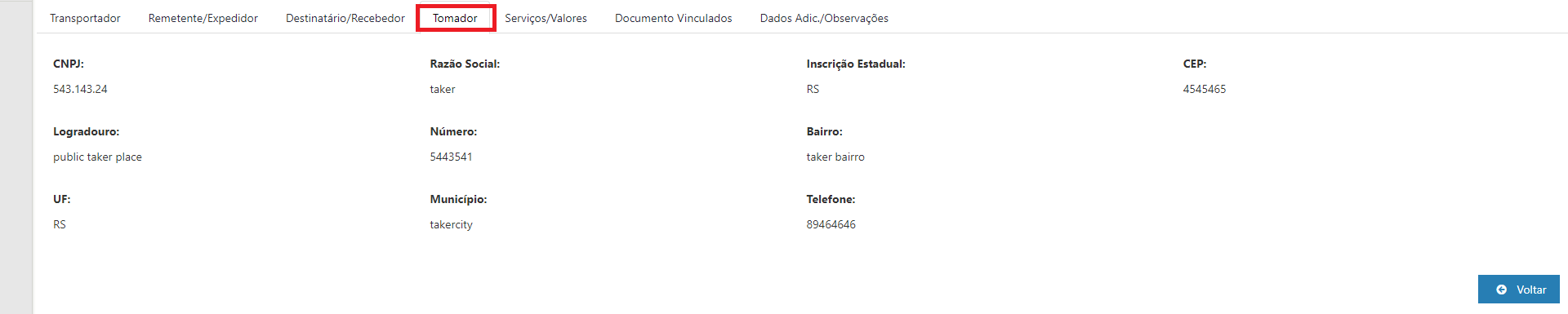A aba Tomador exibe os dados do tomador capturados ao recepcionar o documentos e no caso de NFS-e a filial informada como tomador.