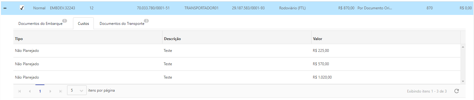 Nos detalhes de cada embarque, ao clicar nodetalhes_icone e selecionar aba Custos, é possível visualizar os custos atrelados ao embarque:
