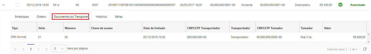 •Documentos do Transporte: Esta aba apresentará os documentos do Transporte vinculados ao documento originário.
