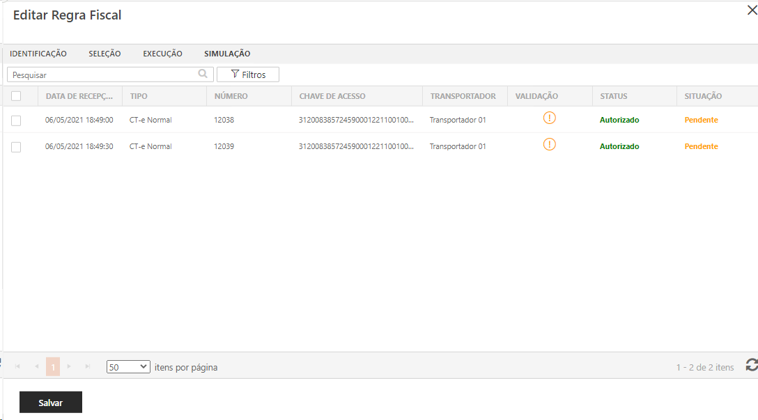 Simulação: Nesta aba é possível ter uma prévia sobre quais documentos a regra será executada.