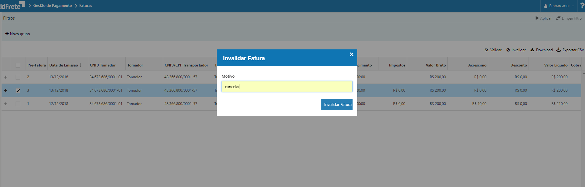 Ao clicar na ação "Invalidar", é possível cancelar somente faturas com a validação pendente e deve-se informar o motivo do cancelamento. Ao invalidar uma fatura, os documentos que pertencem a mesma retornam para pagamento e a fatura fica com a validação inválido.