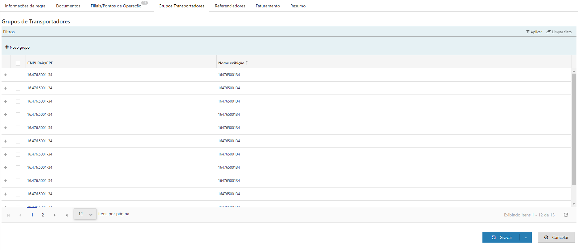 •Grupo de transportadores: Nomes dos grupos de transportadores vinculados a regra.