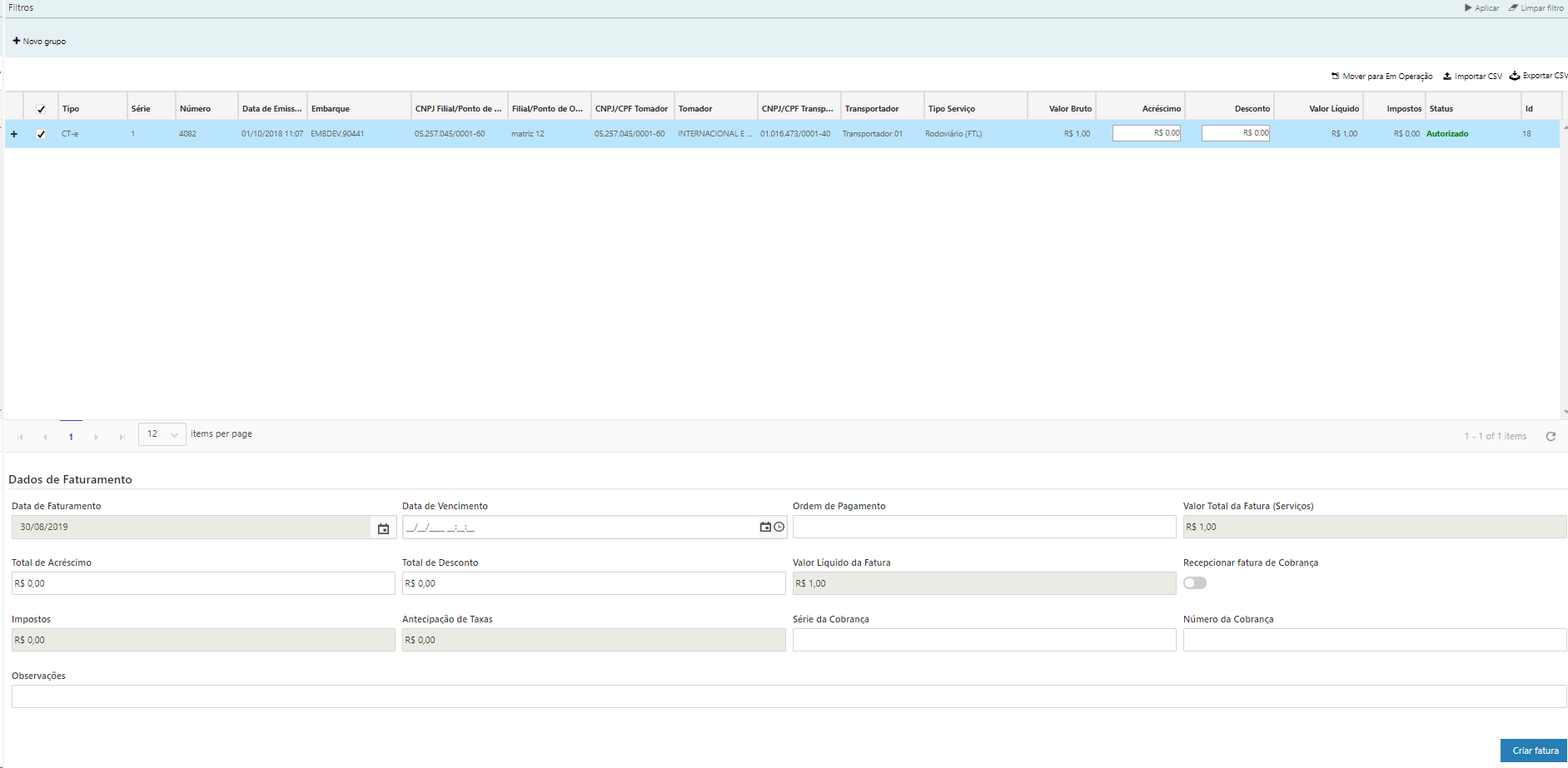 A opção Criar Fatura localizada no canto inferior direito da tela, permite gerar a fatura com as informações de faturamento informadas manualmente em tela, passando os documentos selecionados para o status de "faturamento". Nesse momento é gerada a Pré-fatura para que posteriormente possa ser integrada conforme necessários aos transportadores.