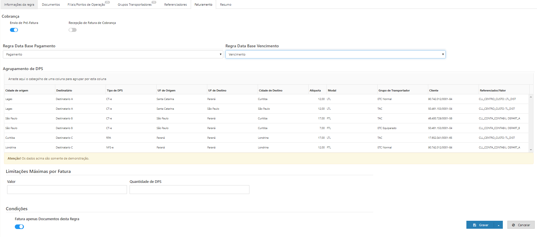 Quando agrupado por Grupo de Transportador, será criado a fatura com os DPSs dos transportadores vinculados ao Grupo, sendo assim é permitido faturas com mais de um transportador. A fatura deve respeitar o CNPJ de faturamento informado no Grupo, caso não possua um CNPJ , deverá criar faturas com CNPJ referente aos transportadores dos DPSs. |