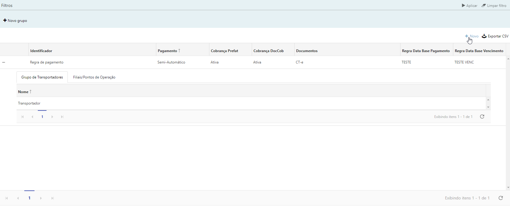 A aba grupo de transportadores permite visualizar os grupos disponíveis para que possam ser vinculados as regras de pagamento, onde serão atribuidos o agrupamento entre regras e os grupos que utilizarão as mesmas.