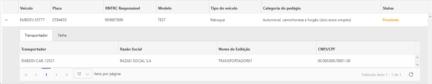 Nos detalhes dos veículos é possível visualizar o transportador vinculado ao mesmo.