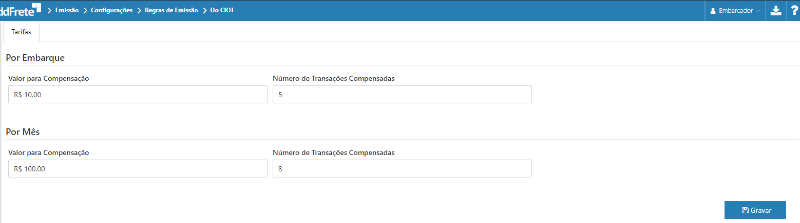 A aba Tarifas apresentará o formulário para configuração das tarifas a serem informadas no CIOT emitido.