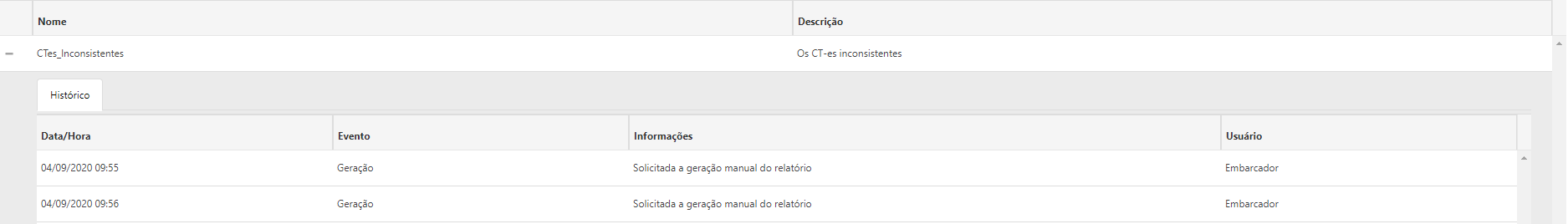 A aba Histórico exibe a lista de eventos registrados sobre os relatórios, através de 'Data/Hora' de sua realização, nome do 'Evento', informações complementares do evento, e nome do usuário que o executou.