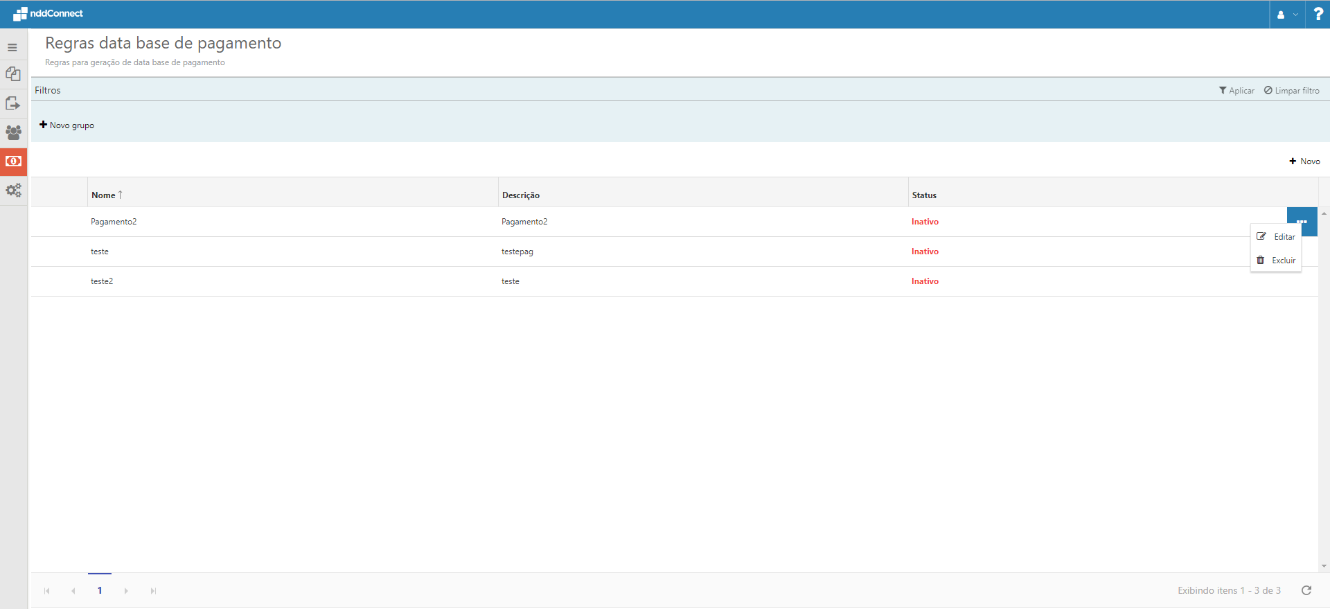 •Excluir: Possibilita a exclusão da regra, caso esta não esteja sendo usada, ou seja, caso seu status seja "Inativo".
