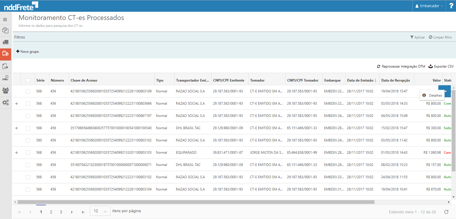 A funcionalidade CT-es Processados relaciona em uma área específica, os CT-es recepcionados do transportador e que foram corretamente internalizados na aplicação.