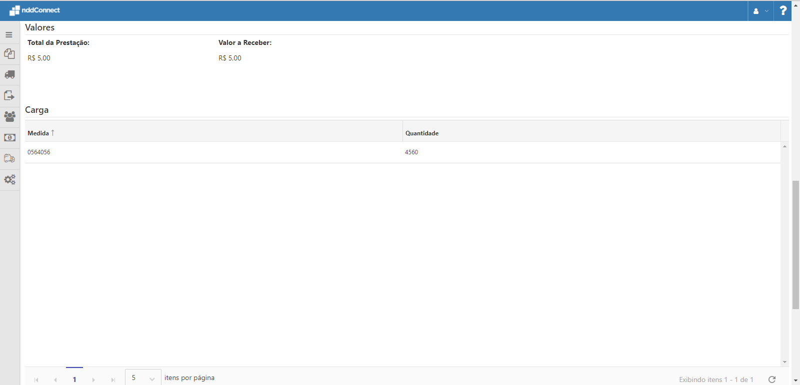 Ao acessar os Detalhes do documento, é possível visualizar os dados gerais do documento, e na primeira aba os dados do Transportador, capturados na recepção do documento. A opção voltar retorna para a tela principal de visualização do documento.