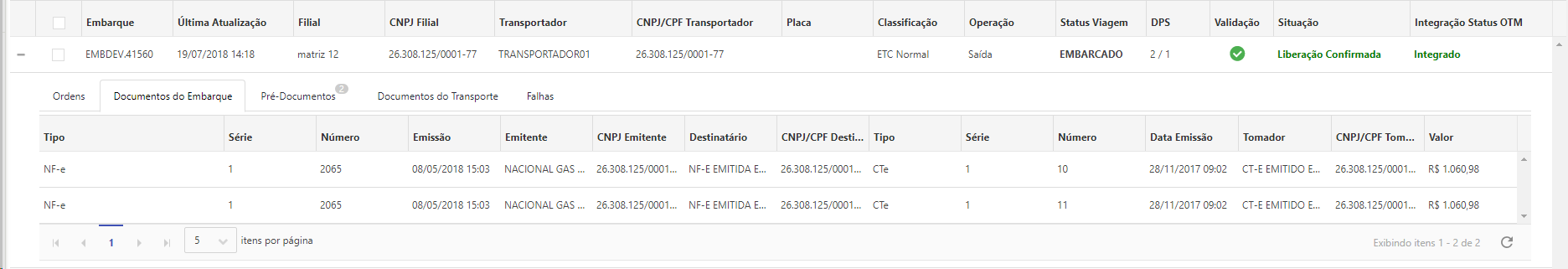 A aba Documentos do Embarque exibe informações das NF-e ou Ordem de Carregamento e os DPS relacionados a estes, referentes ao embarque.