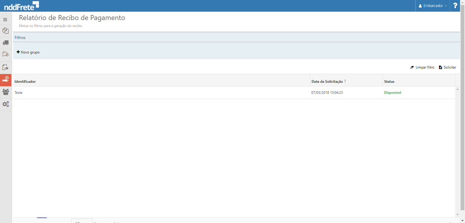 Data da Solicitação: Data da Solicitação do relatório de recibos;