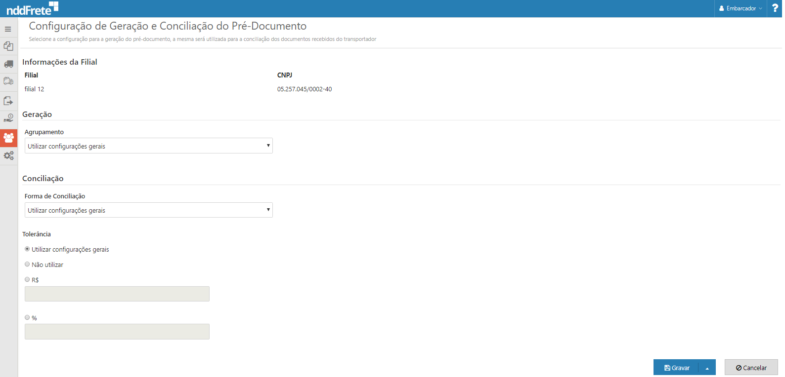 É possível decidir se a filial vai usar suas próprias configurações na geração de Pré-documento e conciliação, ou vai usar a configuração realizada nas configurações gerais. Também é possível determinar um valor de tolerância para que seja feita a conciliação, esse valor pode ser monetário ou em porcentagem.
