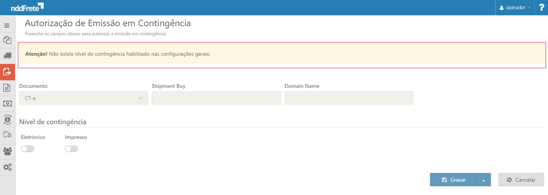 •Nível de contingêcia - Permite habilitar os níveis de contingência de acordo com o que estiver habilitado nas configurações gerais para os níveis de contingências habilitados para CT-e e MDF-e.