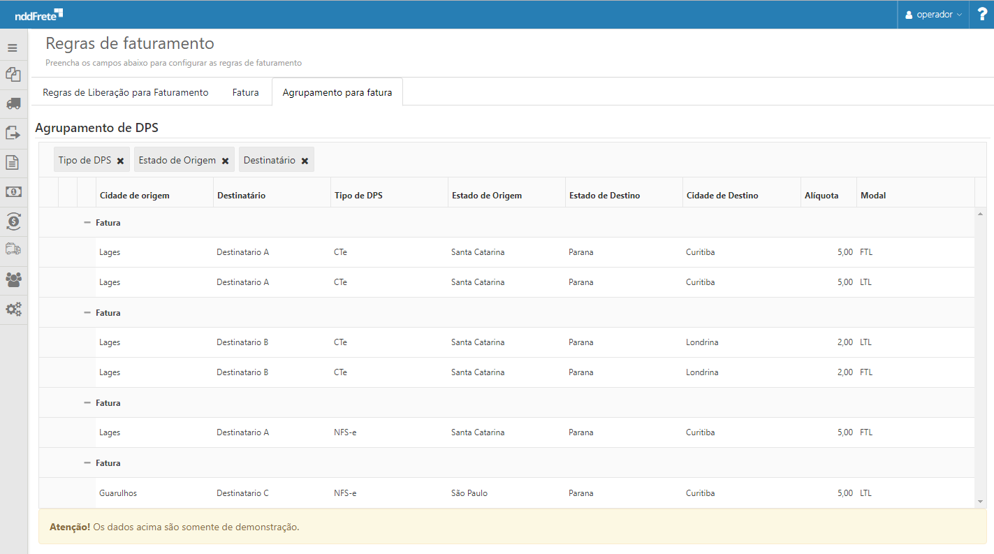 Com intuito de proporcionar maior organização e clareza no processo, o nddFrete disponibiliza dados demonstrativos, pré-cadastrados, para os DPSs faturáveis que irão compor a mesma fatura, na fase em faturamento.