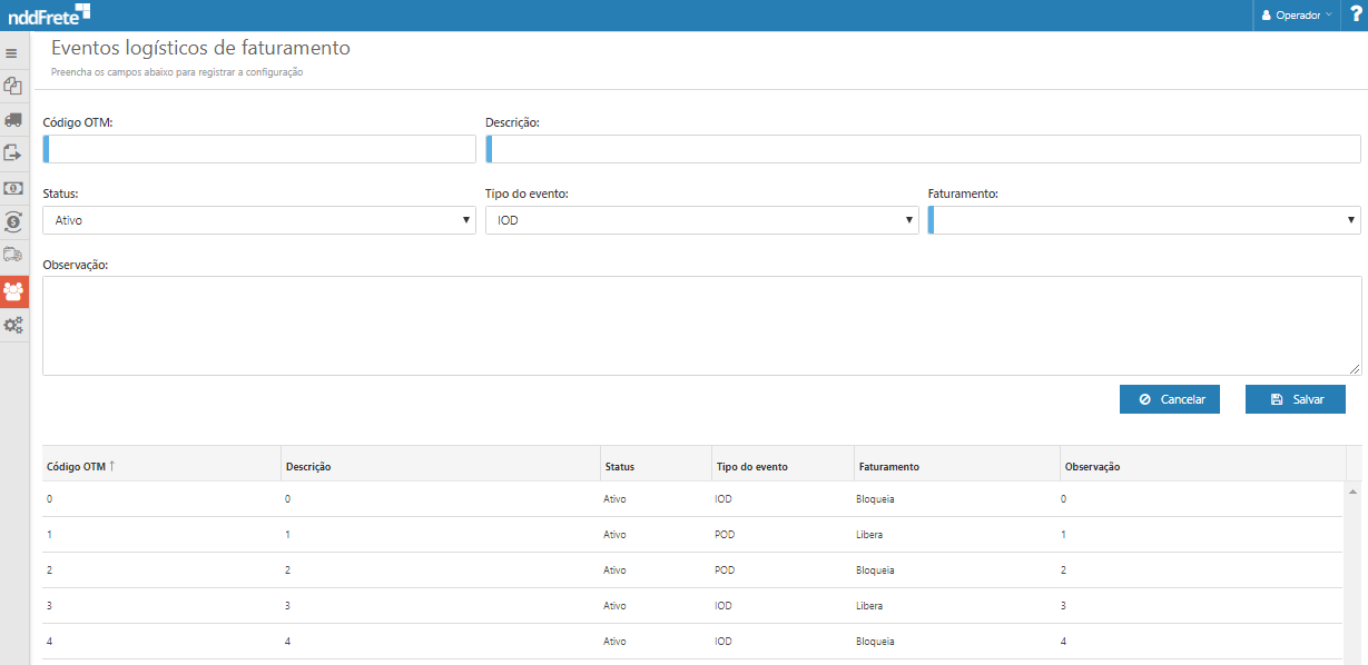 Os eventos logísticos tem o intuito de possibilitar o cadastro dos códigos de eventos relacionados a atualização dos shipments ou suas paradas. Estes eventos podem ser IOD e POD e irão afetar diretamente no processo de faturamento automático, permitindo bloquear ou liberar o faturamento.