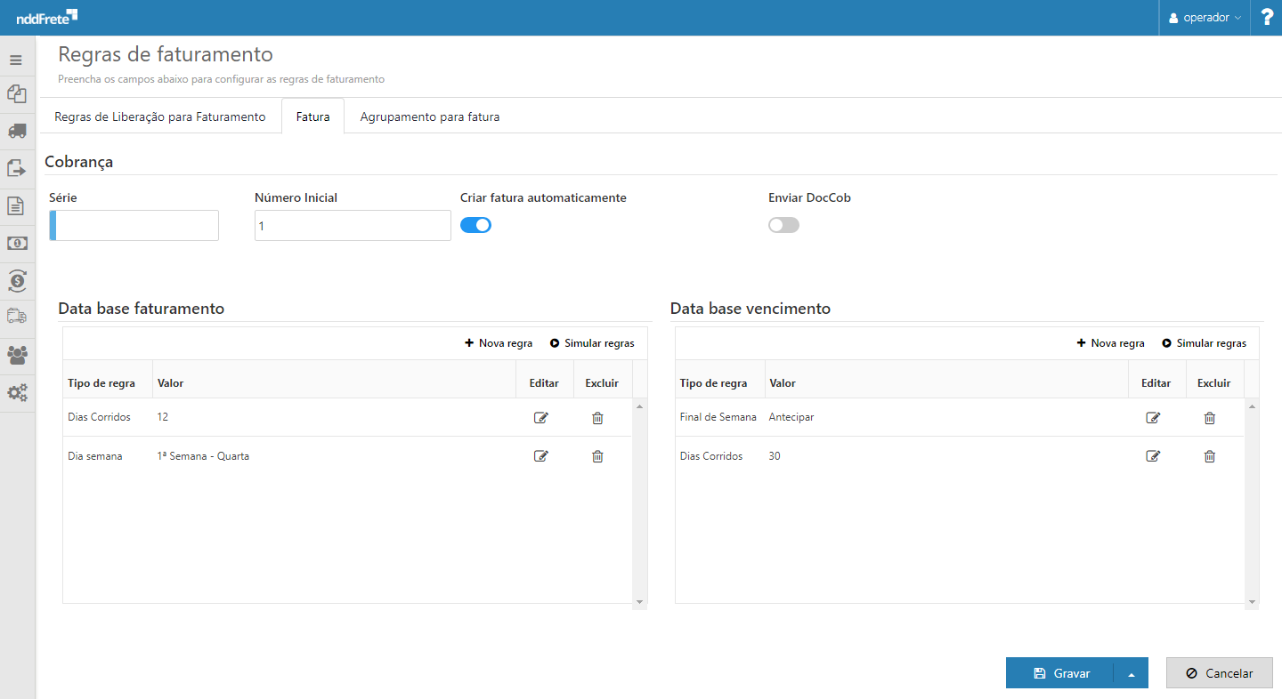 Para cada operação é necessário configurar uma regra de faturamento que será executada no processo automático.