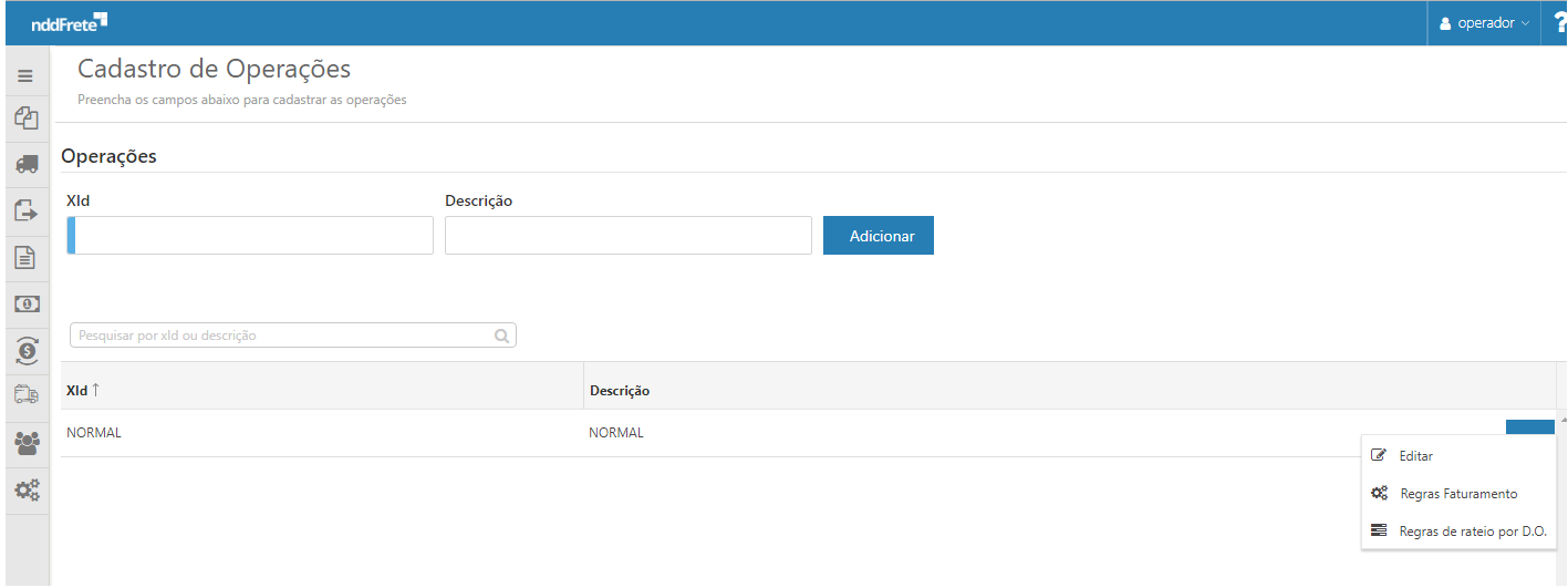 •Ao cadastrar uma operação não é permitido realizar a exclusão da mesma. •A edição é permitida apenas para a descrição, não é possível editar o XID. |