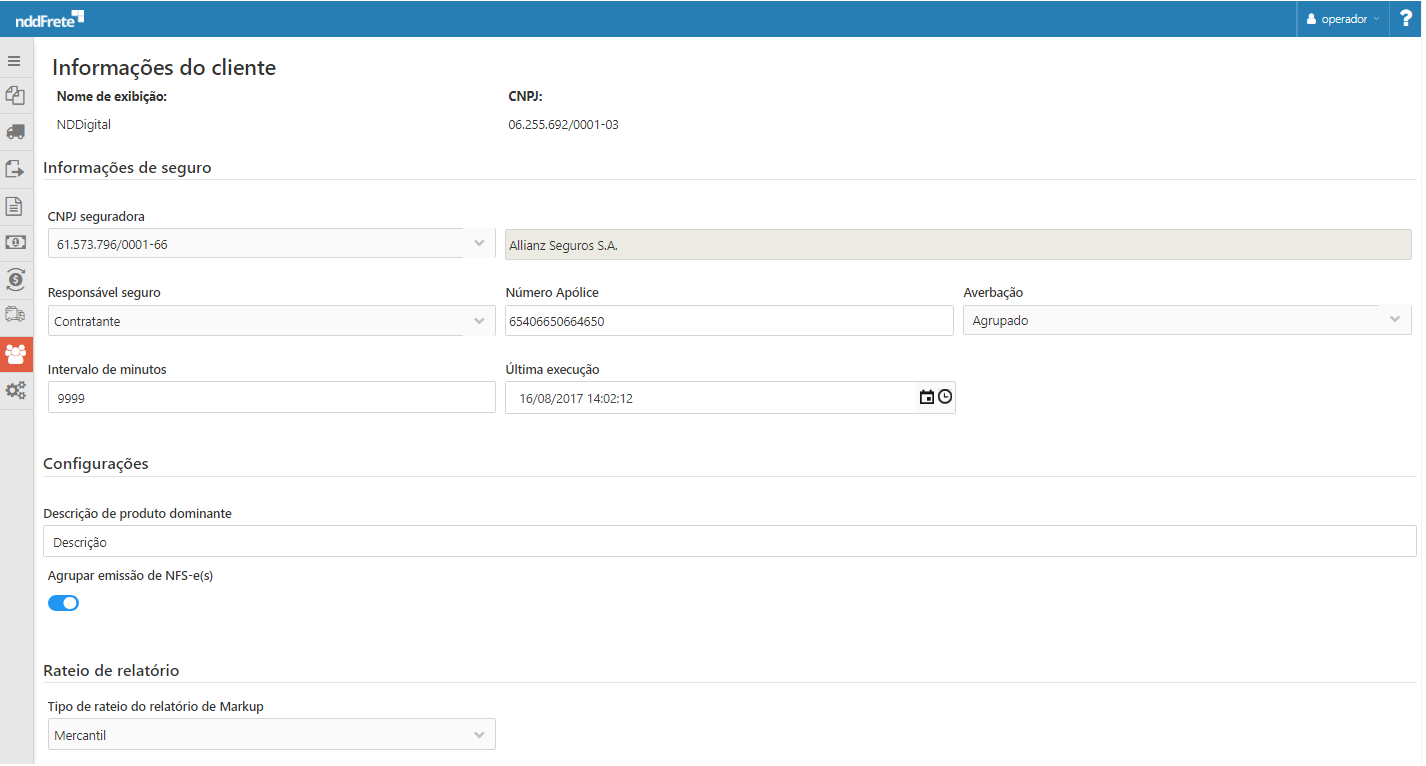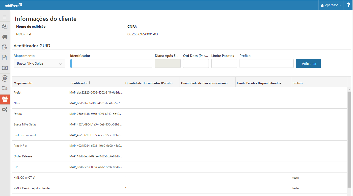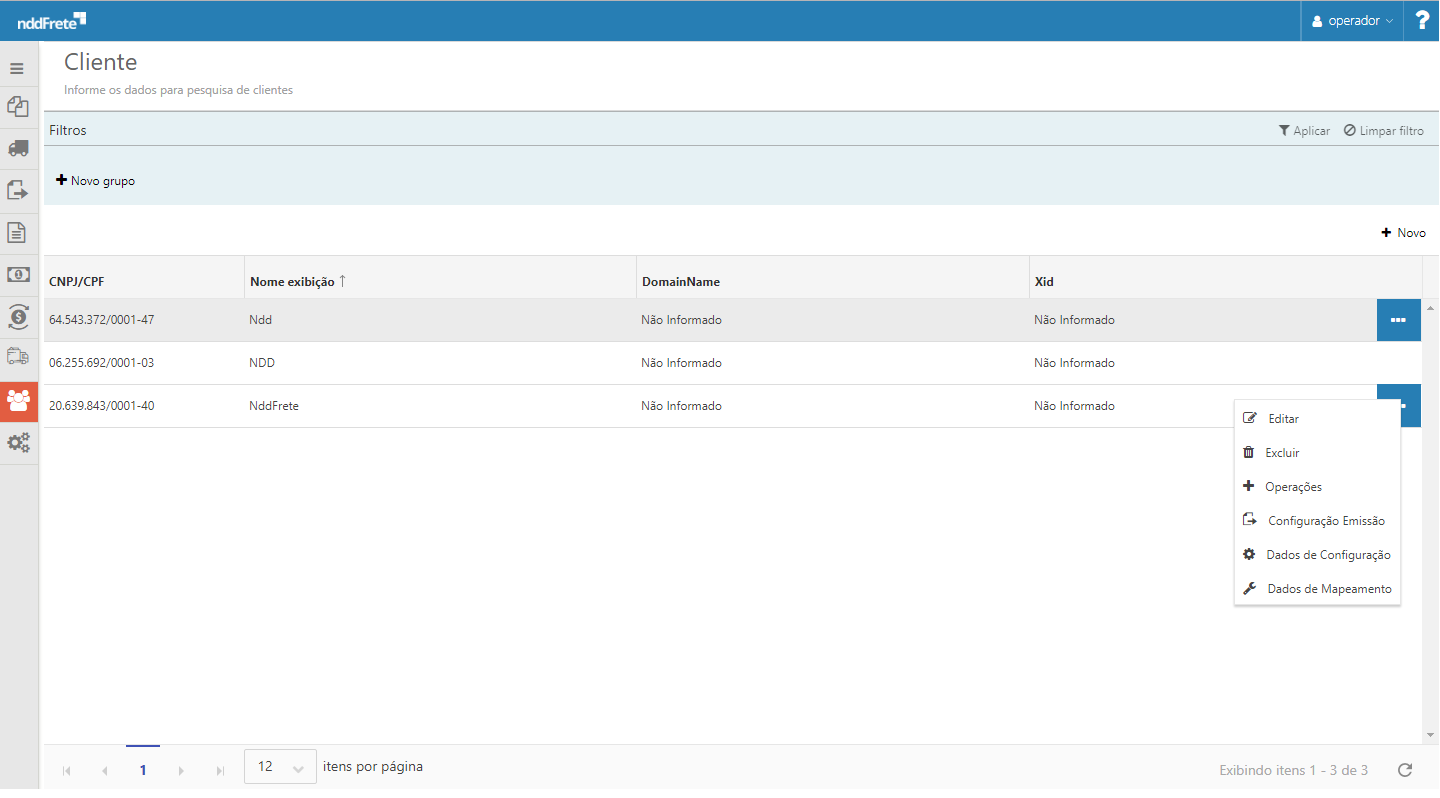 A guia “Cliente” contém as principais informações de todos os contratantes de serviços logísticos, cadastrados no nddFrete.