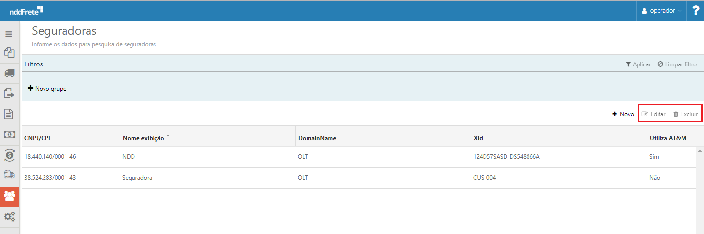 Para excluir o registro de uma seguradora já cadastrada na aplicação, acione o botão