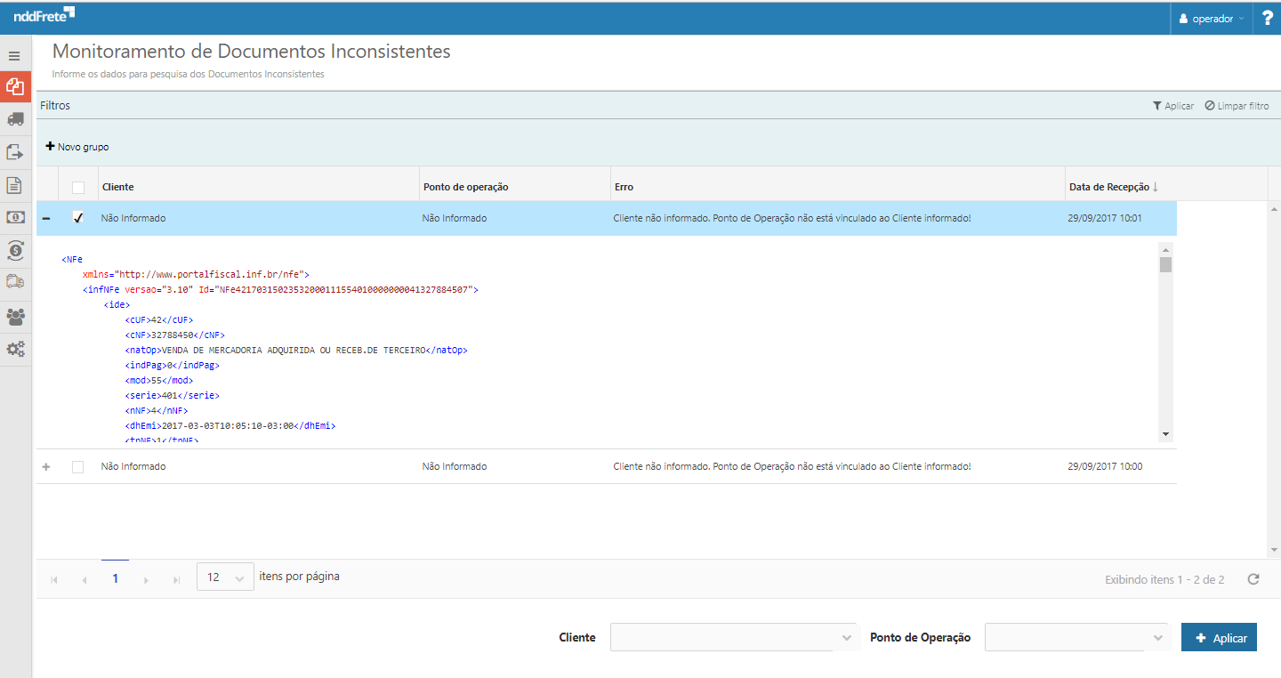 Abaixo da grid é possível informar o cliente e o ponto de operação (caso estes dados sejam os responsáveis pela inconsistência), para que o documento passe novamente pelas validações e sua situação atual seja determinada (não conforme ou disponível).