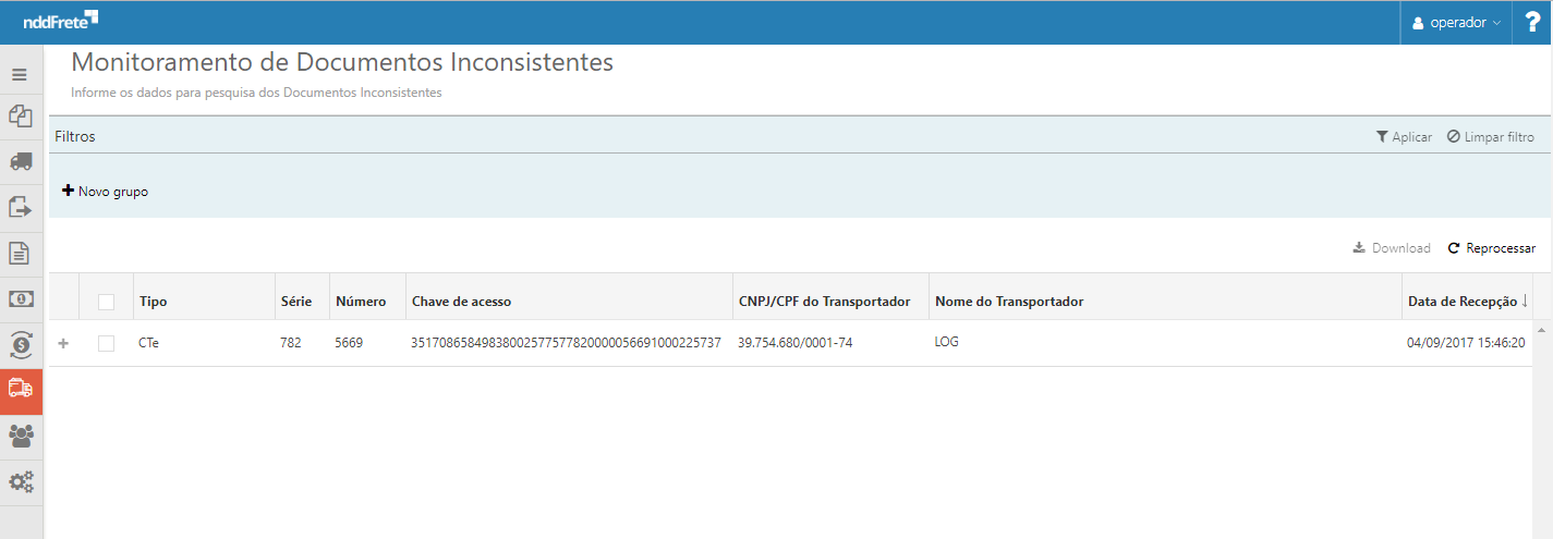 Na tela de monitoramento de "Documentos inconsistentes", encontram-se os documentos do transportador subcontratado, recepcionados via web service ou portal do transportador, que passaram pelas validações de mapeamento e não possuem erros em sua estrutura, entretanto apresentam alguma inconsistência, tais como: