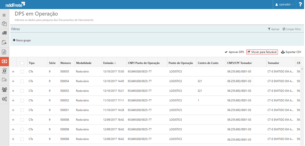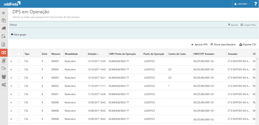 Quando efetuado o download, o nome do arquivo será de acordo com a situação do documento, relacionado com o dia, mês, hora e minuto que foi solicitado a exportação, da seguinte forma: Em_Operação_20_06_17.csv |