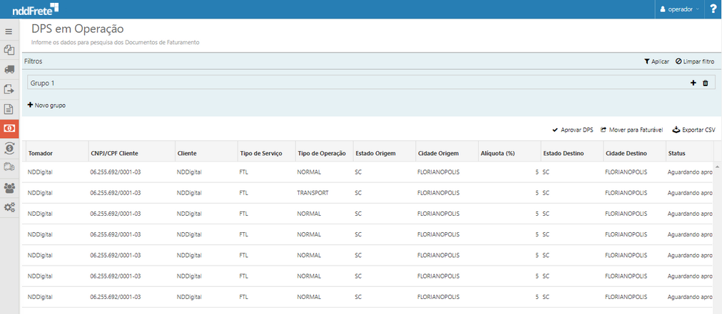 localizada acima da grid, permite exportar as informações dos DPSs em operação para um arquivo no formato CSV, para que possa manipular as informações e disponibilizar aos clientes conforme necessário.