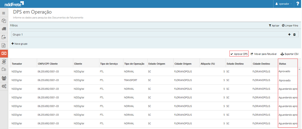 Após a emissão, os DPSs autorizados são recepcionados no faturamento. Onde inicialmente são exibidos na tela de DPS em operação, para seguir o fluxo de faturamento manual ou automático.