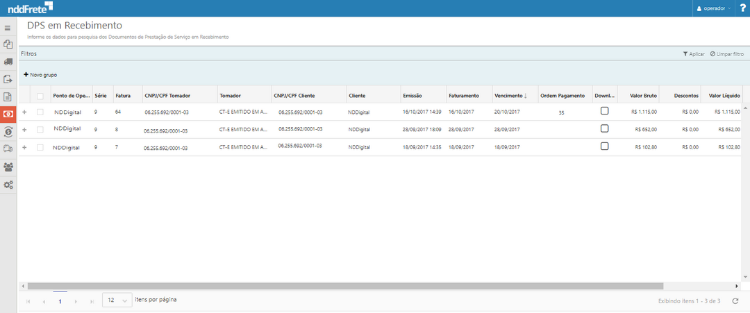 localizada no menu de contexto da grid, permite efetuar o download do documento de cobrança no formato TXT, para disponibilizar aos respectivos clientes. O contexto do documento é montado de acordo com o mapeamento utilizando para fatura, configurada no cliente ou no operador logístico.