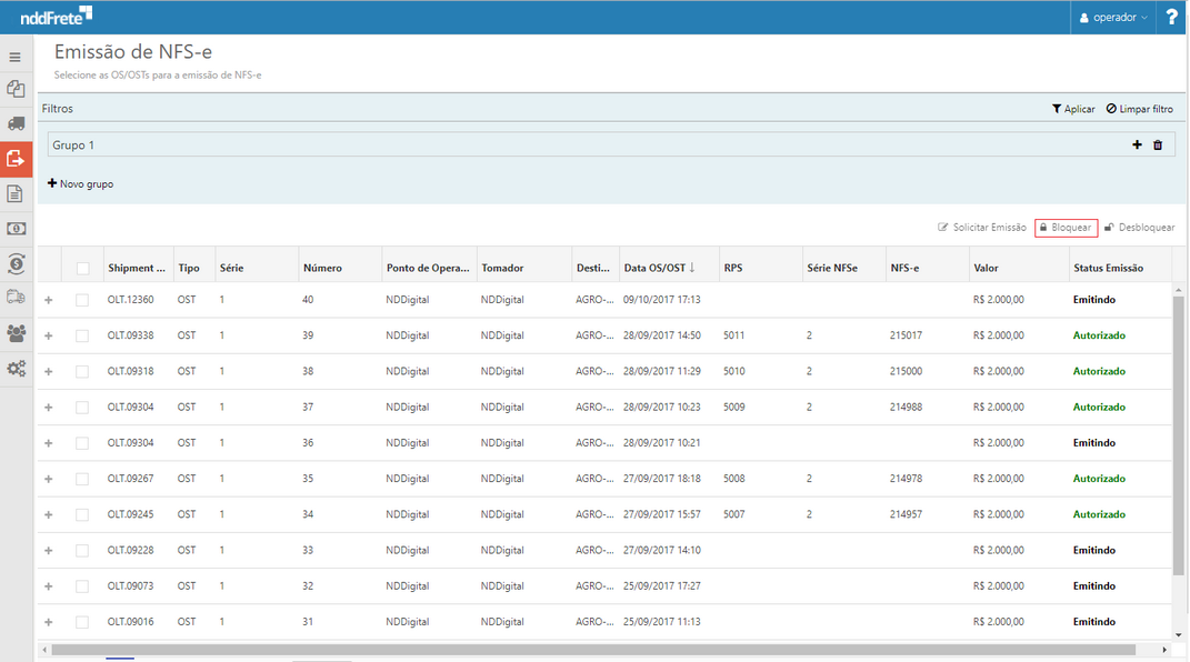 Através da tela de emissão de NFS-e, é possível visualizar as NFS-e OST disponíveis, para que possa solicitar a emissão de notas fiscais de serviço, onde as mesmas sejam integradas com as respectivas prefeituras. Disponível também o opções de bloqueio e desbloqueio de NFS-e para pagamento por motivo de sinistro de carga.
