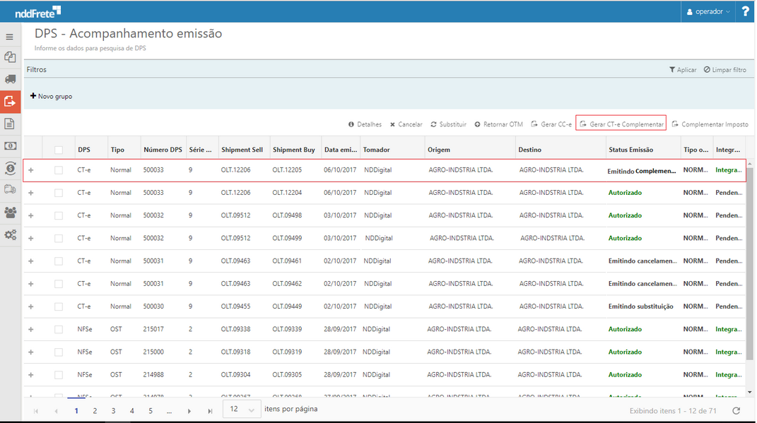 localizada acima da grid, permite complementar um CT-e autorizado que recebeu um novo custo acessório via atualização de embarque, alterando o status deste para "Complementar pendente" (através da atualização de um shipment sell já emitido).