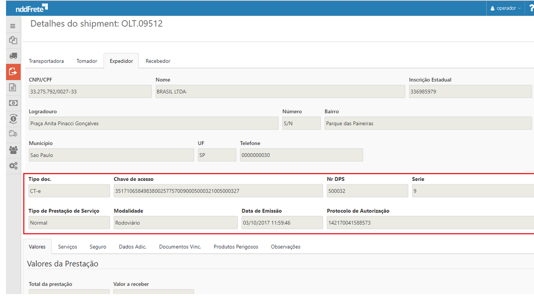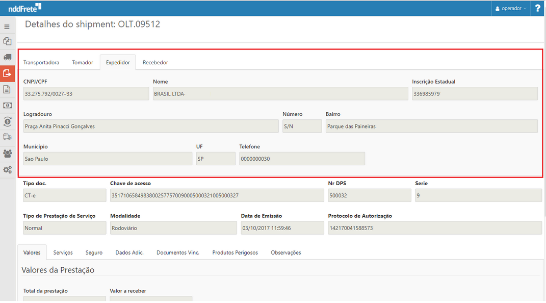 Na parte superior da tela exibe em abas os dados da transportadora, tomador, expedidor e recebedor.